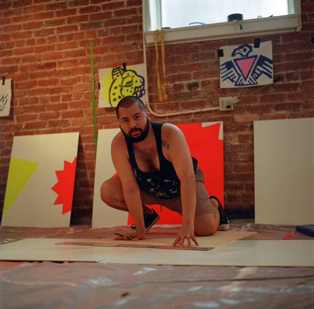 Hernán Martinez, a.k.a. STONED FRUIT, is a multi-disciplinary artist who resides in the Mission of San Francisco, California. He is a self-taught, first-generation Mexican who aims to challenge how we consume fashion and art. His artistic vision, influenced by a radical queer punk ethos, juxtaposes the cultural narratives of his surrounding Latinx community with the bold and stark typography utilized in print media. His debut work, La Frutería, was a mural featured at Adobe Books that explored Pre-Columbian motifs by interpreting the vibrant, fluorescent color palette often seen at Mexican fruit markets.